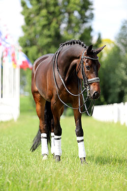 Born: 2010 Sexe: Gelding Colour: Darkbay Height: 16.2 hsFabian is a 10 year old breathtaking beautiful darkbay gelding.16.2 hs. Doing 4 th level. Training PSG LEVEL.